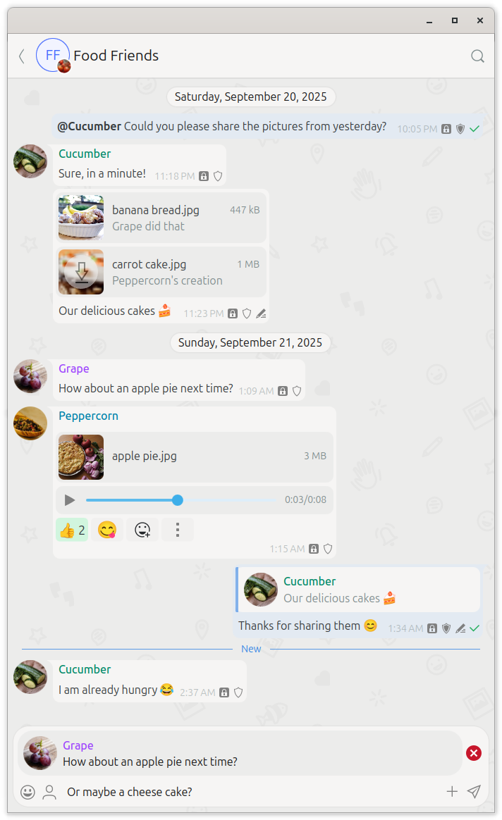 In contrast to the soft keyboard on a mobile device, which needs to be opened each time you want to enter something, your keyboard is always reachable on a desktop device. Why not make use of that circumstance? Kaidan ensures that the most relevant message input field stays focused to allow entering text without an additional click into the corresponding field. That way, you can interact smoothly with the user interface and be more productive.